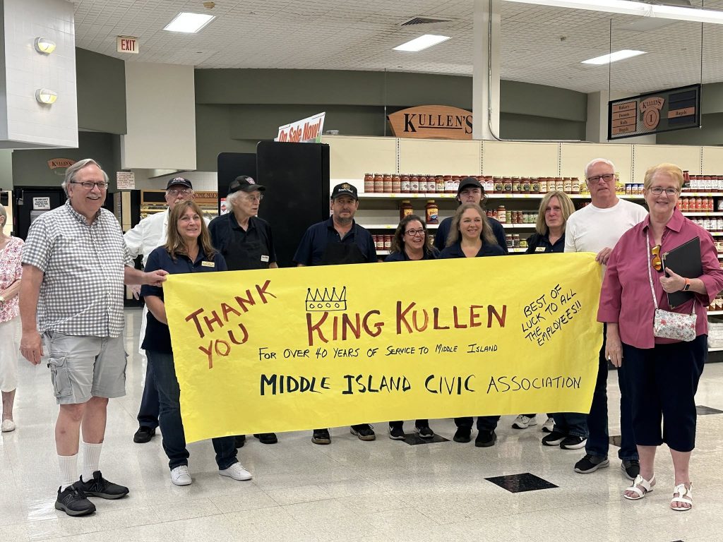 Many thanks to everyone who joined us to bid a fond farewell to long-time King Kullen employees Wednesday, July 9th, 2025 at noon. More than three dozen people helped say goodbye to a staff that’s served our community for decades. Several workers were moved to tears as we handed out appreciation certificates to all. A number will be transferring to nearby King Kullen stores. Thanks to Kevin Mann for the great banner and event coordination. Fingers are crossed that a replacement grocer will occupy that empty store soon.