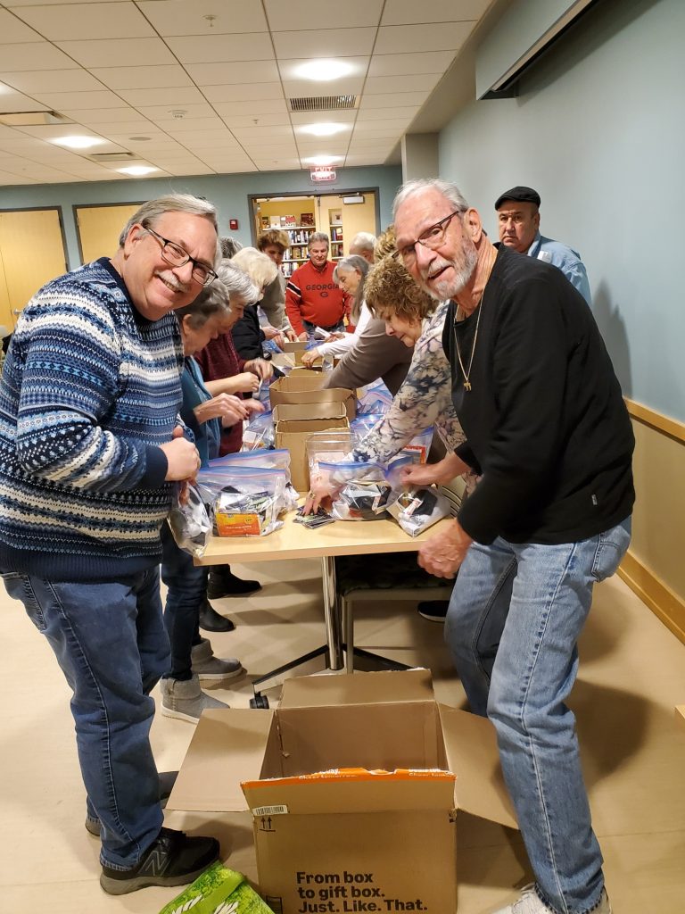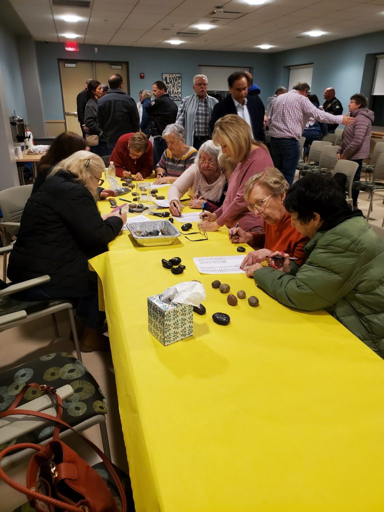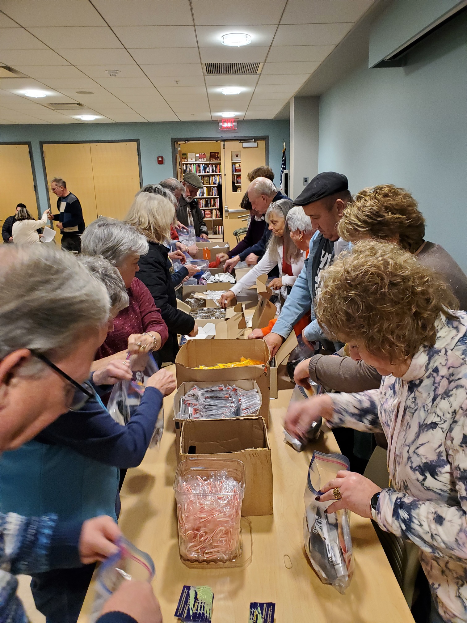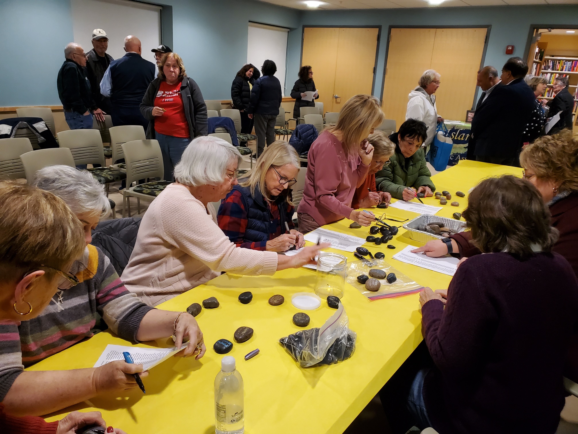 Major portions of the November and December 2025 MICA meetings were devoted to some “Hands On” outreach. On Nov 20th, MICA members carefully printed names of recent military inductees from the Longwood area on polished stones. These were then spray varnished and placed at the foot of the Peace Pole at Bartlett Pond Park on Sun, Dec 7th as part of our Pearl Harbor Day Patriotic Tree Lighting Ceremony. On Dec 18th, MICA held its fifth Goody Bag Assembly Line for Homeless Outreach. One hundred gallon ziplock bags were filled with essential items including a hat, gloves, socks, a mylar blanket, hand warmers, toothbrush & paste, comb, lotion, chapstick, tissues, a candy cane and more. This year’s Good Bags were donated to Branches Long Island. Members always enjoy this assembly line work for the better of the less fortunate in our community!