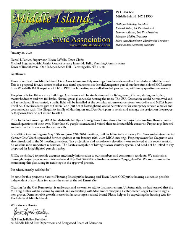 Joe Giaquinto, Mike Kelly, Tim Shea and Chic Voorhis attended our Jan 16, 2025 MICA meeting to provide project updates and answer additional questions. Projected tax revenues, rents and amenity elevations were also displayed and discussed. A Public Hearing Date has yet to be set by the Brookhaven Town Board. Here are the latest concerns expressed at our Jan MICA Board meeting: