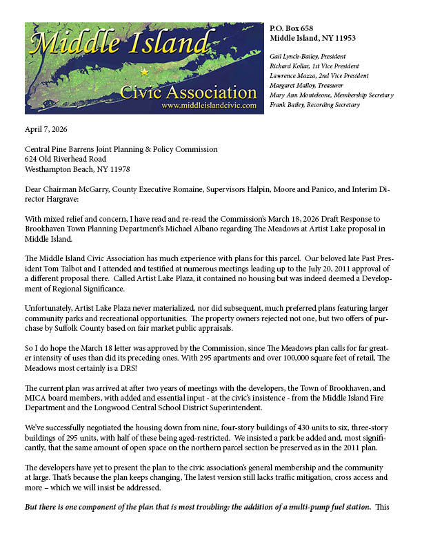 2026 Updates: Top most is a screenshot of the most recent pan for The Meadows at Artist Lake. The plan was featured in a Newsday article published on March 24, 2026. (link below). The huge gas station in the plan’s center is an environmental concern to MICA, as it appears positioned above what was once the northern section of Artist Lake, seen in the historic 1959 USGS photo at center above. MICA sent the letter above to the NYS Pine Barrens Commission, which recently expressed an opinion that the project appears to be a Development of Regional Significance. Also of concern is the Short Street access for the TOB park. It is MICA’s understanding that Short Street is a private road, owned and maintained by the Coventry Manor condominium HOA. The park’s parking lot should be relocated slightly southwest below the basketball courts, with access through the shopping center. The gas station must be eliminated.