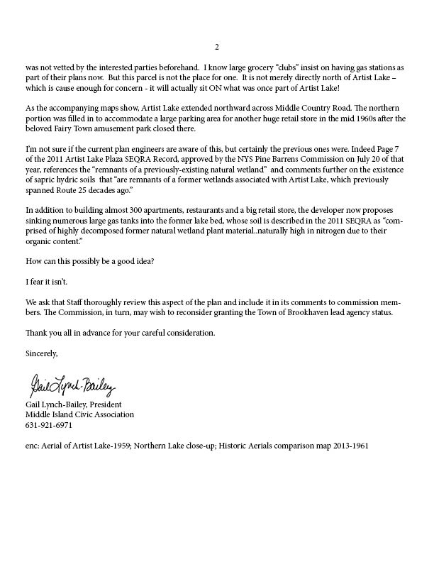 Allow me to take the time to respond to your email regarding Artist Lake development in Middle Island, and any updates to the status since we last corresponded.